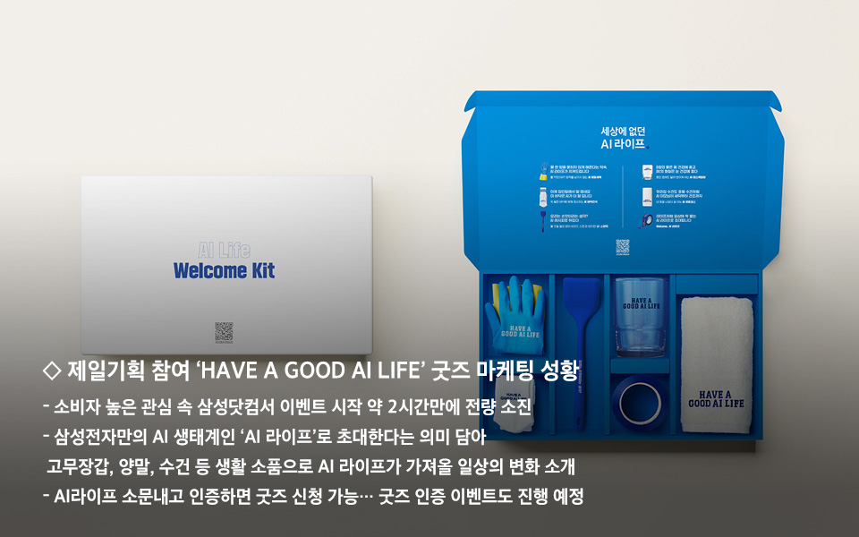 이번 한정판 굿즈는 삼성전자만의 AI 생태계인 ‘AI 라이프’로 초대한다는 의미 담아 기획됐다. 라이프스타일 브랜드 ‘나이스웨더’와 협업해 일상에서 즐겨 쓰는 생활 소품 6종(고무장갑, 양말, 물컵, 수건, 뒤집개, 테이프)으로 구성했으며, 나이스웨더의 슬로건인 ‘HAVE A GOOD DAY’를 인용해 굿즈 이름을 ‘HAVE A GOOD AI LIFE’로 짓고 삼성의 AI를 활용한 즐거운 일상을 표현하고자 했다.