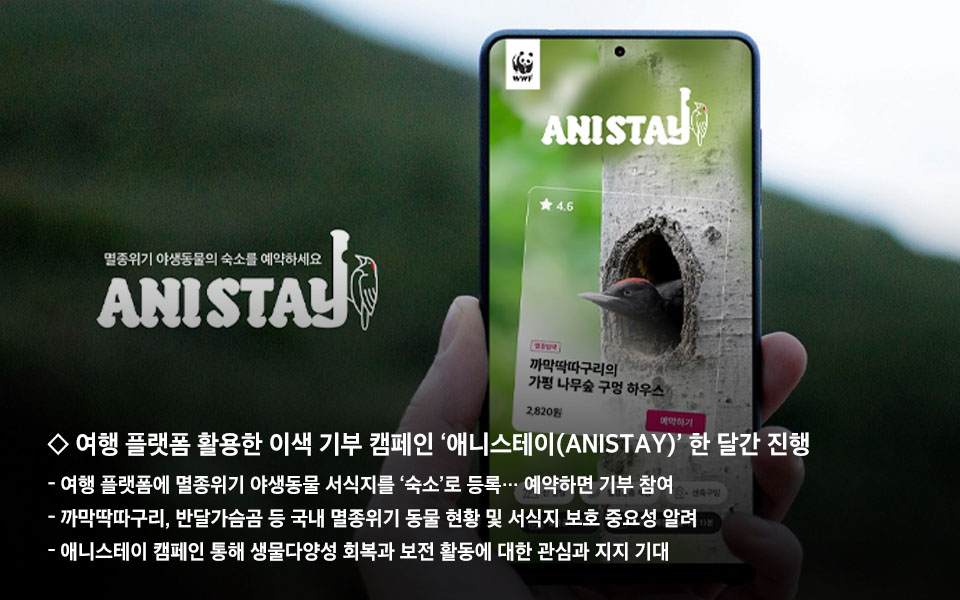 ‘애니스테이’ 캠페인은 여행 플랫폼에 멸종위기 동물의 숙소를 가상의 숙소로 등록해, 국내 멸종위기 동물의 현황과 서식지의 위기를 알리는 한편, 이용자들이 온라인상에서 숙소를 예약하는 방식으로 쉽고 재미있게 기부에 참여할 수 있도록 한 공익 프로젝트다.
