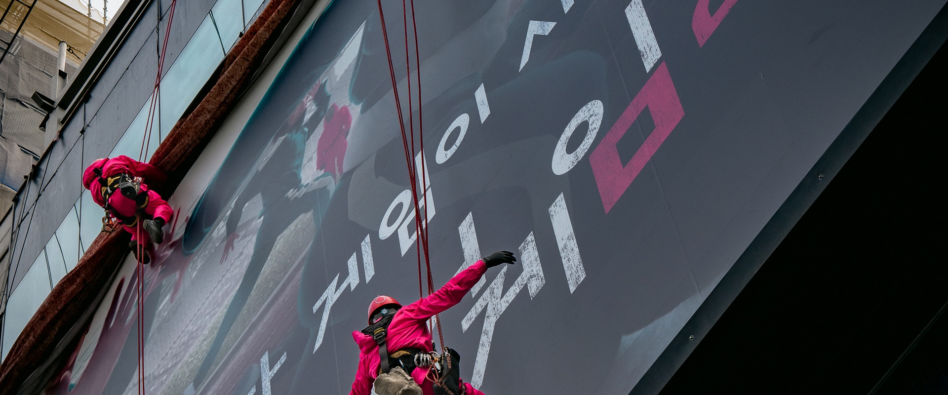 오징어게임의 가장 상징적인 IP인 핑크가드를 작업자로 활용해 엠바고 해제시점인 오전 9시에 맞춰 강남역에서 옥외광고 설치 퍼포먼스를 진행했습니다.