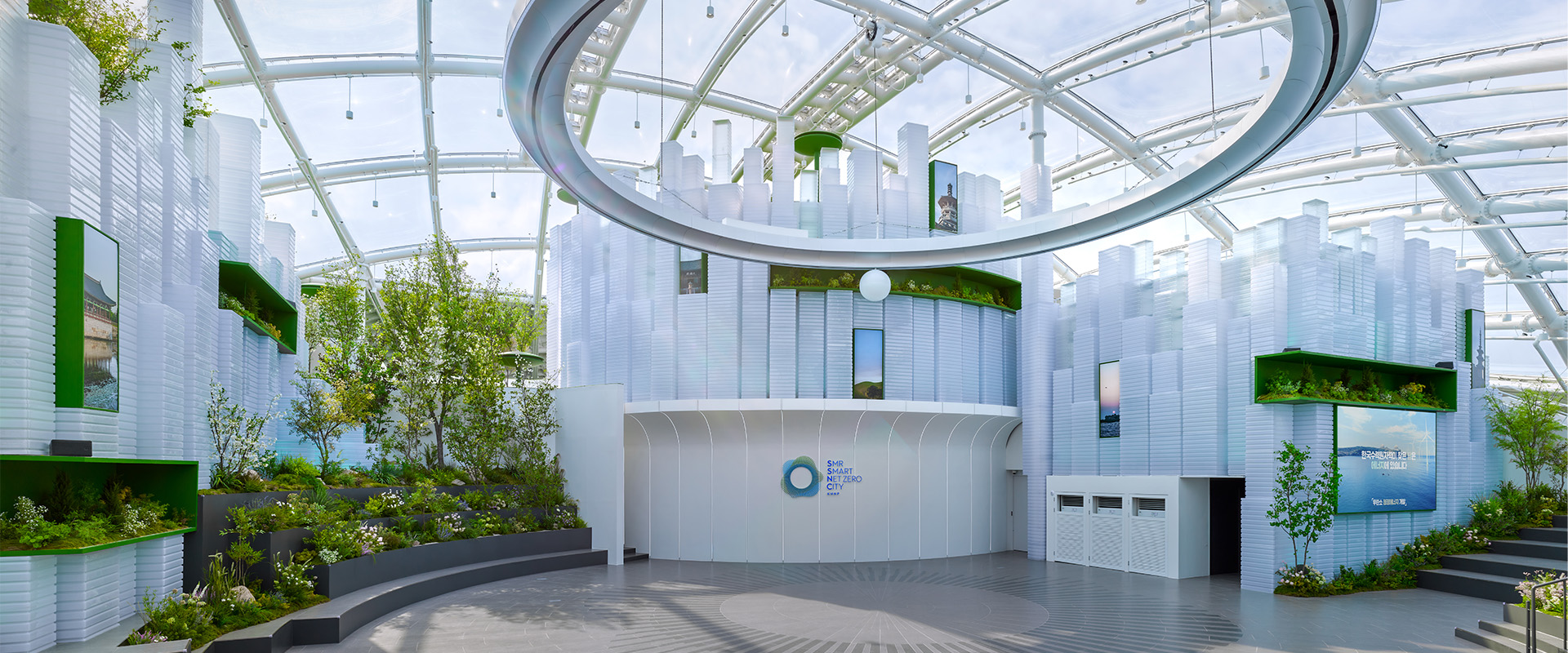 경주의 상징인 ‘고분’에서 착안해 전체 외관을 돔 구조로 설계하고, 로비부터 360° 메인 전시관까지 원형 요소를 일관되게 적용했습니다. 고분의 유기적인 형태를 구현하기 위해 ETFE를 외피 재료로 채택했으며 시공 효율화를 위해 사전 제작 철근 프레임 방식을 활용했습니다. 동시에 한국수력원자력의 기술로 구현된 탄소중립 도시 ‘넷 제로 시티’를 시각화해 기업의 핵심 메시지를 직관적으로 인지할 수 있도록 구성했습니다.